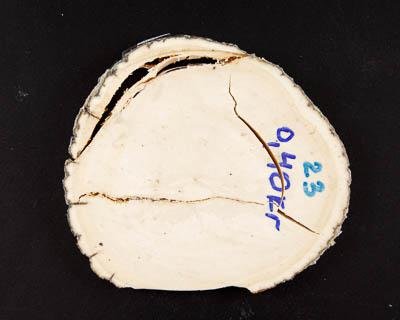 Бивень рассохся. С одной стороны спил грубый, неровный, с другой - относительно гладкий, вероятно, полированный. На спиле четко различимы линии Шрегера. Возраст: ad