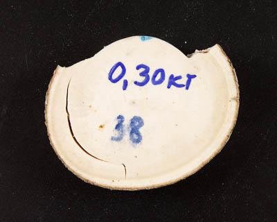 Бивень рассохся. С одной стороны спил грубый, неровный, с другой - относительно гладкий, вероятно, полированный. На спиле четко различимы линии Шрегера. Возраст: ad