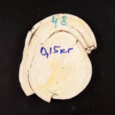 Бивень рассохся. С одной стороны спил грубый, неровный, с другой - относительно гладкий, вероятно, полированный. На спиле четко различимы линии Шрегера. Возраст: ad