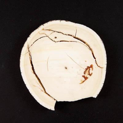 Почти целый поперечный двусторонний срез (спил) бивня мамонта, округлый в поперечном сечении, молочно-желтого цвета с частично сохранившейся внешней поверхностью бивня темно-коричневого цвета. Бивень рассохся. С одной стороны спил грубый, неровный, с другой - относительно гладкий, вероятно, полированный. На спиле четко различимы линии Шрегера. Возраст: ad