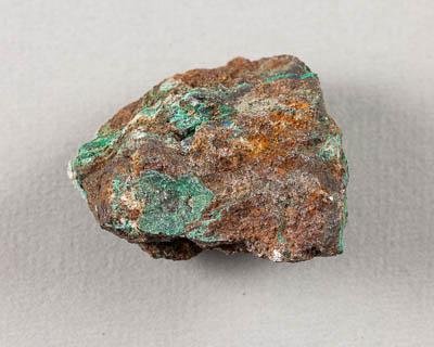 Образец неправильной формы. Массивный. Состоит из плотного зеленого минерала (малахита), рыхлого лимонита рыжевато-коричневого цвета и синего массивного минерала - лазурита. Излом неровный.