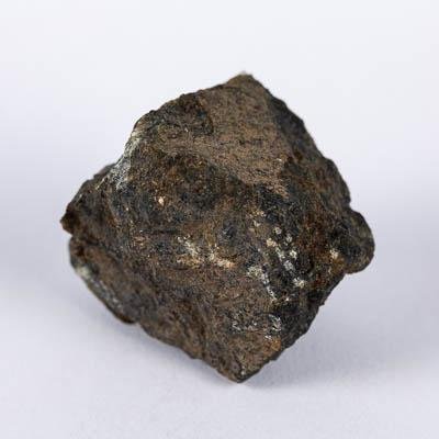 Образец неправильной формы с острыми гранями. Общий тон коричнево-серый. Структура скрытокристаллическая. Текстура массивная. Основная масса представлена породой - пироксенитом с включениями на поверхности мелкокристаллического бронзита, светло-коричневого цвета, непрозрачного блеск на гранях кристаллов стеклянный.