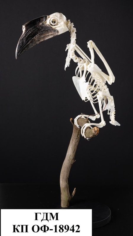Скелет черношлемного калао, сидящего на ветке, на круглой чёрной подставке. Пол: самкa. Возраст: ad