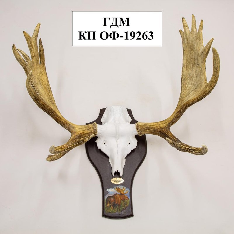Рога лося на лобовине, смонтированые на медальон из дерева, покрашенного в тёмно-коричневый цвет. Отстрелян 3 октября 2006 года. Коллектор Виталий Павлович Антонов-Дружинин. Место добычи - Баунтовский эвенкийский район, Республика Бурятия. Пол: самец. Возраст: ad