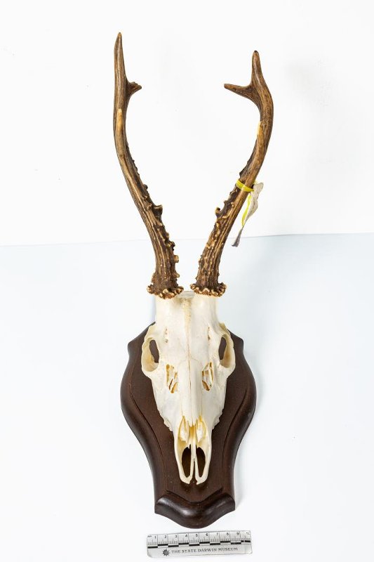 Череп с рогами на медальоне. Косуля сибирская. Capreolus pygargus Pallas, 1771. Классификация: Хордовые Chordata, Позвоночные Vertebrata, Млекопитающие Mammalia, Парнокопытные Artiodactyla, Оленевые Cervidae, Косуля сибирская Capreolus pygargus Pallas, 1771