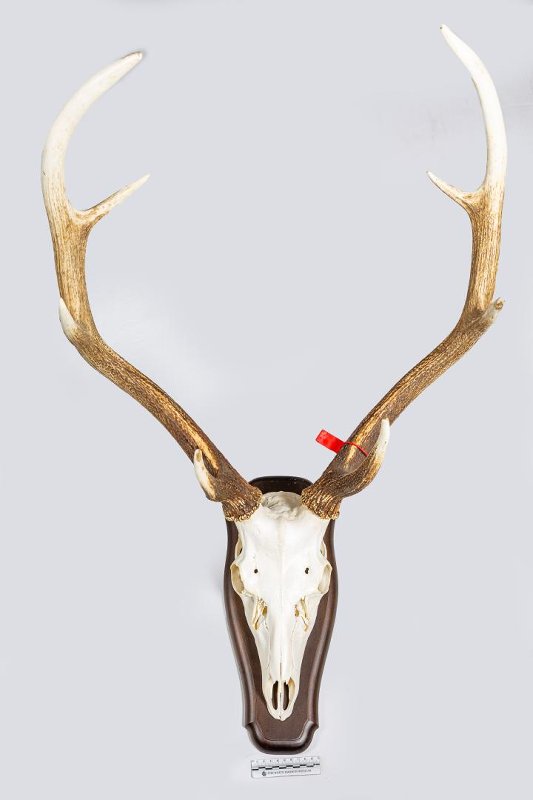 Череп с рогами на медальоне. Пятнистый олень. Cervus nippon Temminck, 1838. Классификация: Хордовые Chordata, Позвоночные Vertebrata, Млекопитающие Mammalia, Парнокопытные Artiodactyla, Оленевые Cervidae, Пятнистый олень Cervus nippon Temminck, 1838