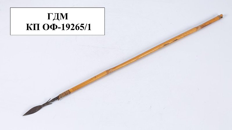Стрела африканская, с железным наконечником и древком из дбамбука. Наконечник - всадного типа (черешковый). Закреплён намоткой из растительных волокон. Форма наконечника: листовидная, плоская в сечении, с двумя тонкими "усами"-зазубринами на очень длинном перекрученном черешке. Длина наконечника с зазубринами - 6,5 см, общая длина с черешком - 10 см. В торцевой части стрелы вырезана V-образная канавка для тетивы.