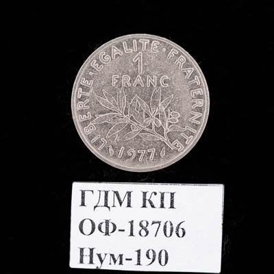 Реверс: В центре надпись в две строки: «1 / FRANC» [1 / франк]. Ниже оливковая ветвь, под ней год чекана: «1977». По кругу надпись: «LIBERTE / EGALITE / FRATERNITE» [Свобода / Равенство / Братство].