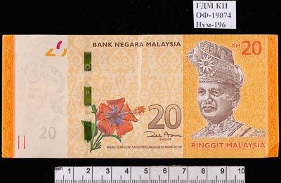 Денежная купюра прямоугольный формы (по горизонтали), достоинством в 20 малайских ринггитов, номер банкноты AZ6969472, выпущенная Банком Негара Малайзия. Доминирующими цветами банкноты является оранжевый.