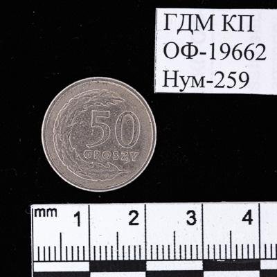 Реверс: Справа номинал : «50 / GROSZY» [50 ГРОШЕЙ], слева полукругом дубовые листья.