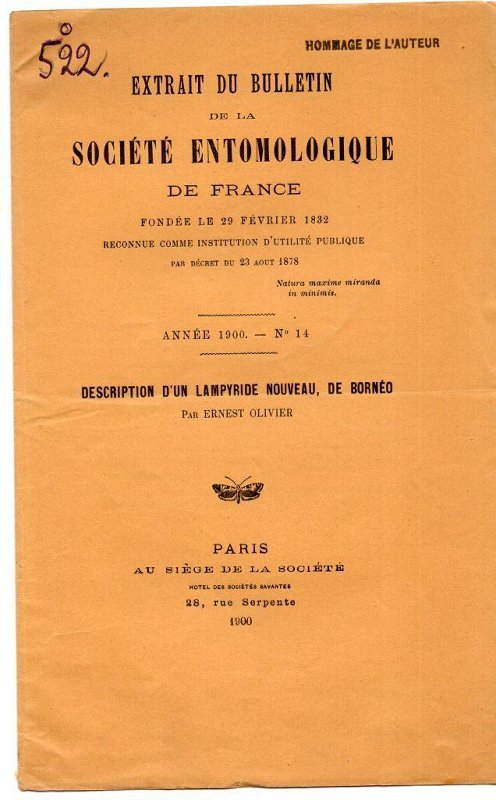 Научная статья французского энтомолога и ботаника Джозефа Эрнеста Оливье (1844—1914), известного специалиста по светлячкам (Lampyridae).