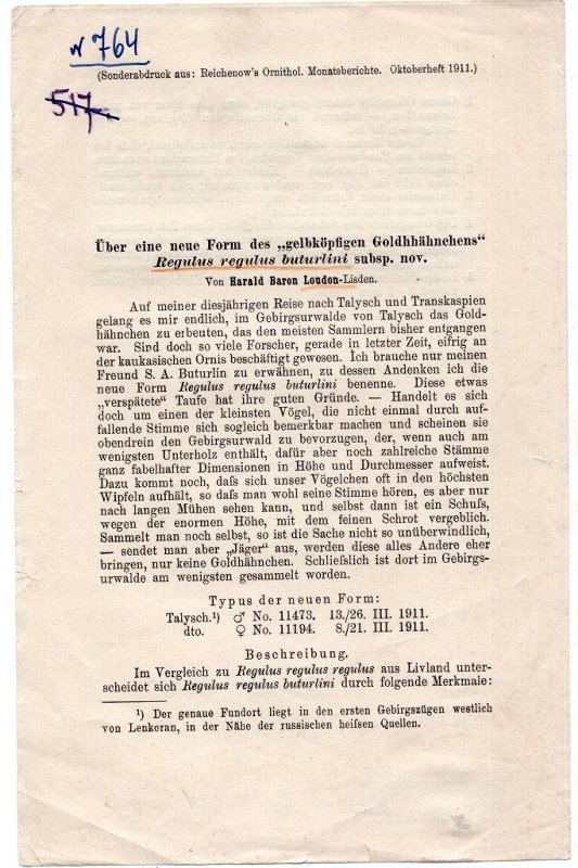 Оттиск статьи барона Гарольда фон Лоудона (Лоудон, Гарольд Викторович, или Харальд Георг Гидеон фон Лоудон; 1876—1959), российского, латвийского и немецкого орнитолога, путешественника. Первое описание подвида Желтоголового королька.