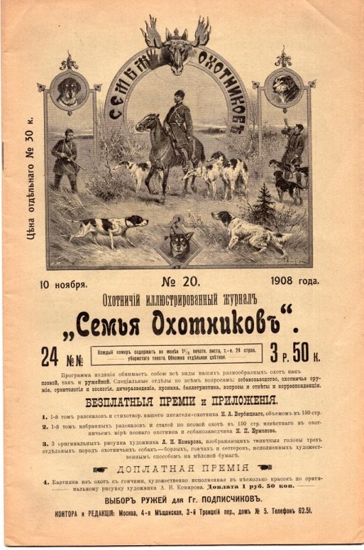 Двадцатый номер журнала, 10.11.1908. Редактор-издатель Александр Алексеевич Торсков, крестьянин Бол. Залом, Веневского уезда, Тульской губернии, помощник и секретарь Озерова С.В. Журнал выпускался за счёт средств и энтузиазма как самого издателя, так и людей не равнодушных к охотничьему делу. Издание публиковалось два раза в месяц до 1914 года.