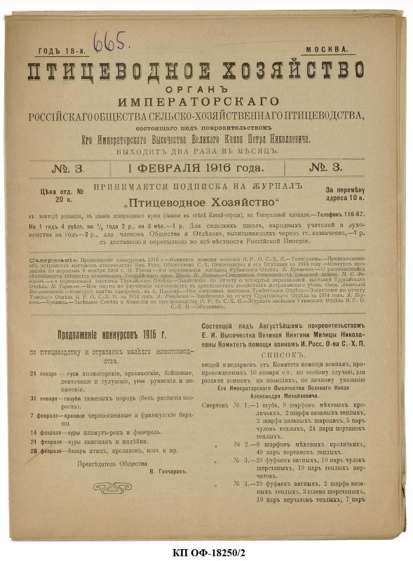 Третий номер журнала «Птицеводное хозяйство» за 1915 г. Этот журнал — орган Российского общества сельскохозяйственного птицеводства, выходит в Москве с января 1899 г. по два раза в месяц. Журнал состоял под покровительством Его Императорского Высочества Великого Князя Петра Николаевича. В журнале публиковалась информация о конкурсах, выставках, новостях, печатались объявления.