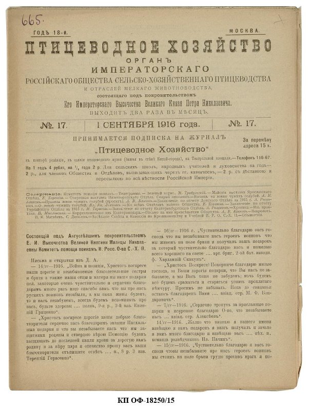 Семнадцатый номер журнала «Птицеводное хозяйство» за 1915 г. Этот журнал — орган Российского общества сельскохозяйственного птицеводства, выходит в Москве с января 1899 г. по два раза в месяц. Журнал состоял под покровительством Его Императорского Высочества Великого Князя Петра Николаевича. В журнале публиковалась информация о конкурсах, выставках, новостях, печатались объявления.