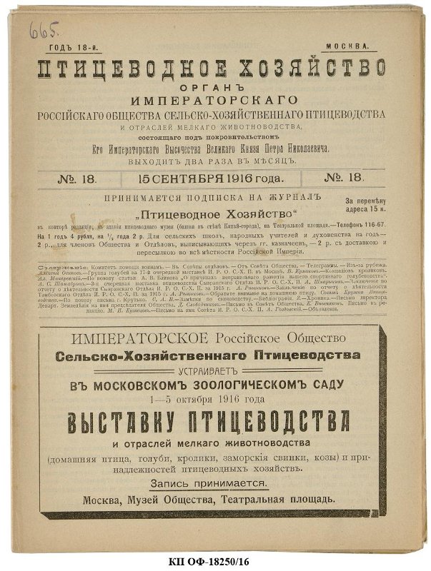 Восемнадцатый номер журнала «Птицеводное хозяйство» за 1915 г. Этот журнал — орган Российского общества сельскохозяйственного птицеводства, выходит в Москве с января 1899 г. по два раза в месяц. Журнал состоял под покровительством Его Императорского Высочества Великого Князя Петра Николаевича. В журнале публиковалась информация о конкурсах, выставках, новостях, печатались объявления. В журнале есть объявление А. С. Хомякова о продаже кроликов (с. 407).
