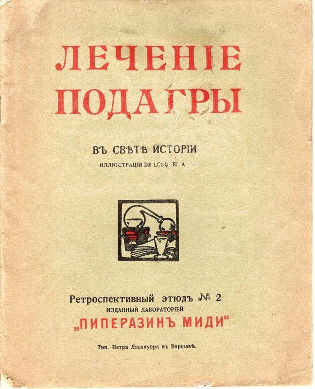 Реклама лекарств варшавской лаборатории «Пиперазин Миди». Подагра (др.-греч. ποδάγρα, буквально — капкан для ног) — метаболическое заболевание, известное с глубокой древности. Первые документальные свидетельства заболевания известны из Древнего Египта. Исторический обзор лечения этого заболевания проиллюстрирован французским художником плакатистом Анри Даниэлем Казимиром Полем Туру, известного под именем Даниэля де Лоск (фр. Henri-Daniel-Casimir-Paul Thouroude dit Daniel de Losques, 1880—1915). На титульном листе: Ретроспективный этюд № 2, изданный лабораторией "Пиперазин миди".