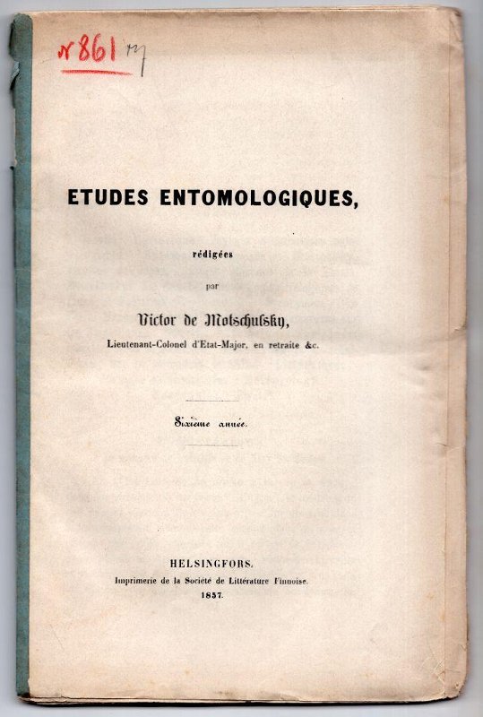 Шестая часть «Энтомологических этюдов» российского энтомолога, офицера и разведчика Генштаба Виктора Ивановича Мочульского (1810—1871). Он описал много новых видов насекомых, преимущественно российской фауны и, в первую очередь, жужелиц, считается знаменитым колеоптерологом. В каталоге Хомякова А. С. отмечено как «редкое» издание.