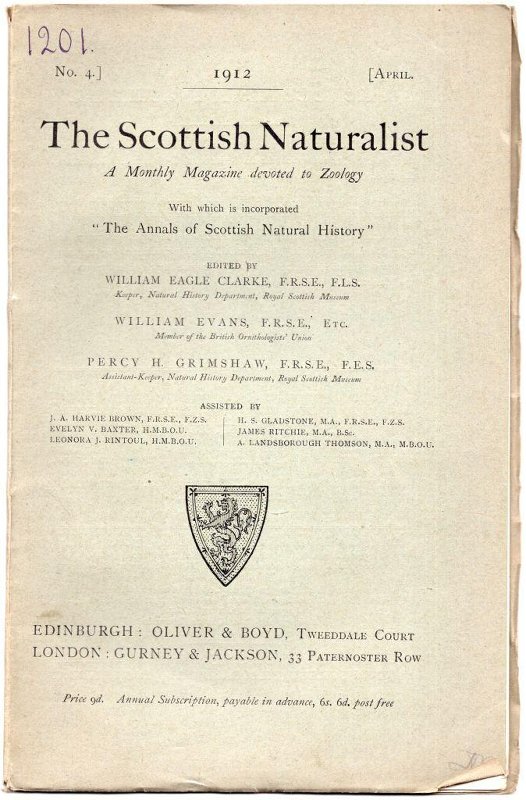 Четвертый номер журнала за 1912 г. До 1912 г. журнал выходил под названием «The Annals of Scottish Natural History», который был основан в 1892 г. Журнал включал статьи по зоологии, палеонтологии и ботанике Шотландии. Редакторы журнала: британский орнитолог Кларк, Уильям Игл (англ. Clarke, William Eagle; 1853—1938), хранитель с 1906 по 1921 гг. Королевского шотландского музея; шотландский натуралист, орнитолог Эванс, Уильям (англ. Evans, William; 1851—1922); английский энтомолог и зоогеограф Гримшоу, Перси Холл (анг. Grimshaw, Percy Hall), эксперт по чешуекрылым.