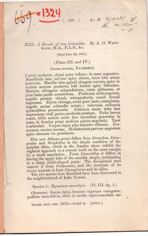 Оттиск статьи английского энтомолога Джона Обадия Вествуда (англ. John Obadiah Westwood; 1805—1893) о новых видов из семейства Бронзовки. Статья была напечатана в сборнике «Труды королевского энтомологического общества Лондона». Общество было создано в 1833 г. Литографии изготовлены в мастерской «Mintern Bros imp», раскрашены вручную акварелью.