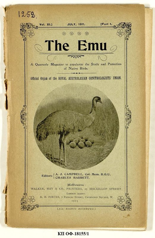 Июльский номер журнала Эму за 1911 — австралийский орнитологический журнал для публикации научных исследований в различных областях науки о птицах. С 1901 года публикуется Royal Australasian Ornithologists Union.