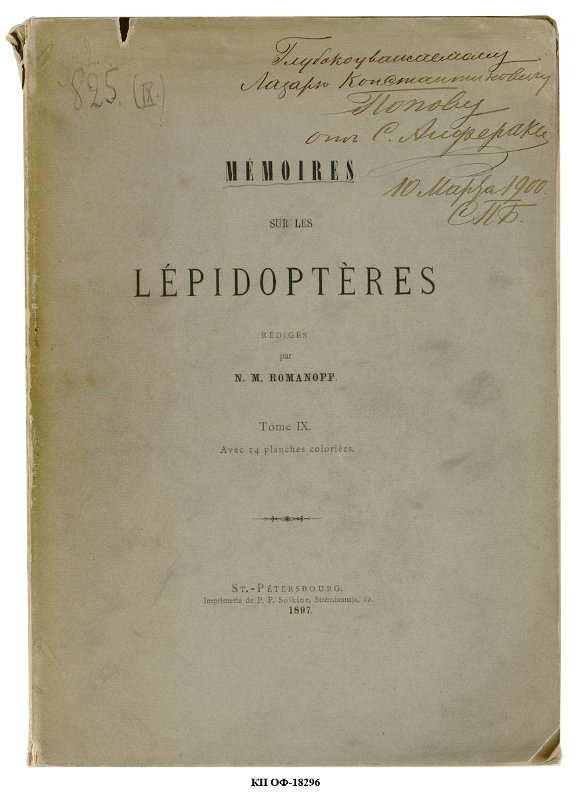 Многотомное иллюстрированное издание Великого Князя Николая Михайловича Романова (1859—1919), русского генерала от инфантерии, историка и энтомолога, сыгравшего заметную роль в становлении и развитии отечественной лепидоптерологии. Главным вкладом Николая Михайловича явилось многотомное издание "Mémoires sur les Lépidoptères", известное как «Работы Романова» и выходившее в Петербурге под его редакцией (1884—1897). Девятый том, изданный в 1897 г. содержит статьи русского орнитолога и энтомолога, крупнейшего специалиста по бабочкам Сергея Николаевича Алфераки (1850—1918); немецкого и российского энтомолога, этнографа Альфред-Отто Фёдоровича Герца (1852/53—1905). Издание сопровождается цветными иллюстрациями бабочек на различных стадиях развития, выполненными с высокой точностью. Печатная промышленность того времени не давала возможности создать качественные цветные иллюстрации, поэтому специальной литографо-офсетной печатью печатались только контуры бабочек, которые потом от руки раскрашивались акварельными красками. Поэтому "Мемуары" имели большую себестоимость и ограниченный тираж, в результате чего они стали раритетами. Статьи публиковались на французском или немецком языкаx.