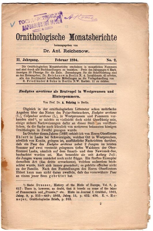 Второй номер журнала за 1894 года. Периодическое издание по орнитологии, известное в конце XIX и начале ХХ веков. Журнал был основан в 1893 г. немецким орнитологом Антоном Райхеновым (также Рейхенов, нем. Anton Reichenow, 1847—1941). С 1893 по 1921 годы Райхенов был главным редактором журнала по орнитологии «Journal für Ornithologie». В это время он публиковал также орнитологические месячные отчёты. Сначала журнал выходил ежемесячно, с 1922 г., несмотря на название — раз в два месяца. В 1944 г. выпуск был прекращен.