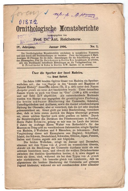 Первый номер журнала за 1896 г. Периодическое издание по орнитологии, известное в конце XIX и начале ХХ веков. Журнал был основан в 1893 г. немецким орнитологом Антоном Райхеновым (также Рейхенов, нем. Anton Reichenow, 1847—1941). С 1893 по 1921 годы Райхенов был главным редактором журнала по орнитологии «Journal für Ornithologie». В это время он публиковал также орнитологические месячные отчёты. Сначала журнал выходил ежемесячно, с 1922 г., несмотря на название — раз в два месяца. В 1944 г. выпуск был прекращен.