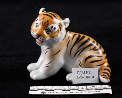 Скульптурное изображение сидящего тигренка без подножия. Животное сидит, чуть завалившись на правое заднее бедро. Голова с открытым ртом поднята вверх и повернута налево. Хвост лежит на земле, загибаясь налево. Тигренок золотисто-песочного цвета с черными полосками; грудь, живот, концы лап, низ морды, область вокруг глаз и ушей - белые. Нос, рот и уши изнутри - розовые. Глаза желтые; ноздри, усы и когти - черные.