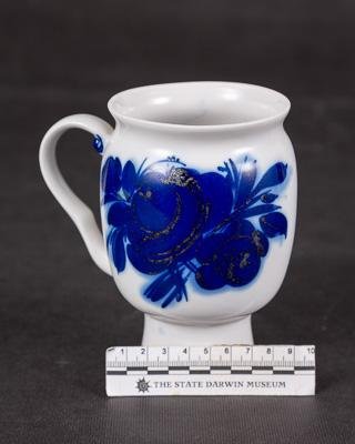 Сосуд - бокал с крышкой - на конической ножке, с изогнутой ручкой, в верхней части оканчивающейся небольшим завитком. Бокал по белому фону с двух сторон расписан кобальтом: крупные стилизованные розы в окружении листьев и веточек.