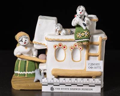 Баба печет хлеб в печи. Игрушка глиняная каргопольская.