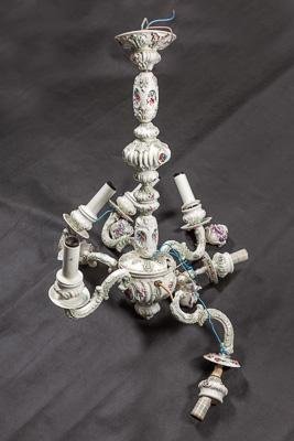 Фарфоровая люстра на шесть рожков с подвесками, одноярусная. Центральный стержень состоит из пяти белых фарфоровых элементов, последовательно закрепленных на латунном штыре. На всех элементах присутствует роспись в виде розовых и голубых садовых цветов. В нижней части люстры округлая фарфоровая чаша с тремя овальными медальонами с изображением букетов розовых и голубых цветов. Медальоны обрамлены по окружности рокайльной каймой. Завершает чашу снизу фарфоровый элемент с шишкой. От чаши отходит ярус шести фарфоровых изогнутых s-образных кронштейнов с рельефными листьями аканта. На конце их круглые розетки с рельефными венками из розовых цветов. Свечники фарфоровые, в виде маленьких чаш белого цвета, с росписью в медальонах (на белом фоне розовые цветы). Наверху свечников белые цилиндры, в которые вставлены патроны, подведенные под электричество. К шести кронштейнам крепятся подвески в виде маленьких розовых букетов, обращенных головками вниз. Вся конструкция крепится на одном несущем латунном штыре.