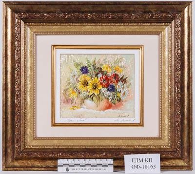 Композиция горизонтального формата, на перламутровой пластине изображен букет цветов в округлой светло-бежевой вазе. Верхняя часть вазы скрыта листьями цветов. Букет состоит из желтых, красных, фиолетовых и белых с желтыми серединками цветов. Слева от вазы на условной поверхности лежат несколько желтых лепестков.