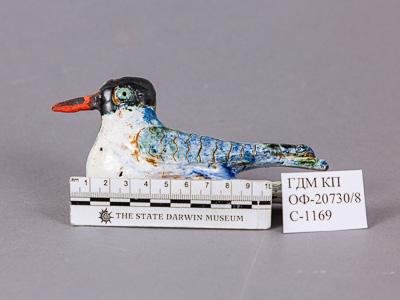 Скульптурное стилизованное изображение сидящей чайки. Голова чуть повернута налево, глаза открыты, крылья сложены и прижаты к бокам. Грудь и живот чайки белого цвета; крылья, хвост и спина - голубые, на концах - синие. Голова черного цвета, глаза голубые. Клюв красный, по его бокам - продольные черные полоски. На крыльях фактура оперения передана волнистым углубленным рельефом.