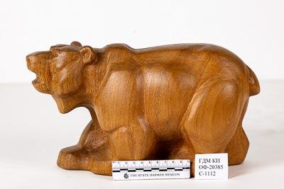 Скульптурное изображение идущего пещерного медведя без подножия. Голова слегка повернута налево, пасть приоткрыта. Лапы зверя показаны слитым воедино монолитом: правая передняя лапа выставлена вперед, правая задняя - отставлена назад. Левые лапы сближены. Все формы скульптуры обтекаемые, гладкие.