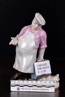 Скульптурное изображение персонажей басни И.А. Крылова «Кот и повар»: повара, который стоит, оперевшись на бочку, и кота, поедающего еду возле нее. Повар одет в розовую рубашку белый фартук, на голове поварской колпак. Бочка серого цвета, перед ней сидит черно-серый кот. Подножие овальной формы, по краю идет золотой ободок.