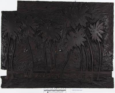 На доске горизонтального формата изображен лес пальм с тонкими стволами и раскидистыми кронами.