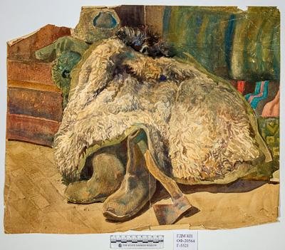 Натюрморт с овчинным полушубком, валенками, ушанкой и топором. Рисунок