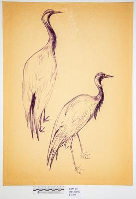 На листе вертикального формата изображены 2 стоящих журавля-красавки в профиль вправо.