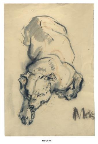На листе вертикального формата изображена лежащая собака породы американский стаффордширский терьер белого окраса. Собака лежит головой к зрителю, положив морду на вытянутую вперед правую переднюю лапу.