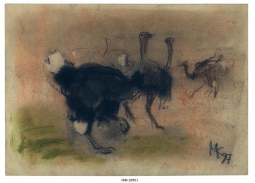 На листе горизонтального формата изображены африканские страусы: две птицы на первом плане в центре, одна - на втором справа, и силуэт птицы сзади слева.