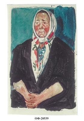 На листе вертикального формата изображен поясной портрет сидящей пожилой женщины в фас. На голове повязан белый платок с красными, голубыми и желтыми цветами, глаза открыты, взгляд направлен влево. Женщина одета в черное платье с рукавами по локоть, руки со сцепленными пальцами сложены на коленях. Фон - синий.