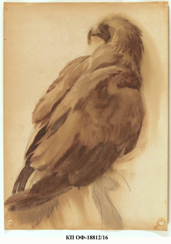 На листе вертикального формата изображен в профиль направо орел, сидящий на ветке. Голова поднята вверх и повернута налево. Оперение орла светло-коричневое, к маховым перьям темнеет.