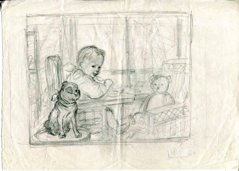Композиция горизонтального формата, изображен ребенок, сидящий в детском кресле со столиком. Перед ребенком стоит глубокая тарелка, в руке он держит ложку. На шее повязана салфетка. Рядом слева сидит на круглом пуфе мопс с бантиком на шее. Справа перед ребенком стоит кресло, в котором сидит игрушечный медвежонок. Голова ребенка повернута в сторону собаки.