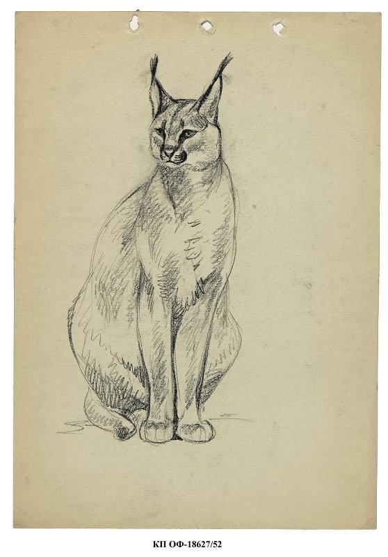 На листе вертикального формата изображен в фас сидящий каракал. Голова поднята вверх и чуть повернута налево, уши с длинными кисточками - насторожены. Передние лапы поставлены рядом, хвост прижат к правому заднему бедру. По акту №8-ВХ от 23.04.2012 данная работа была записана как «Рысь сидящая», но изображен каракал.