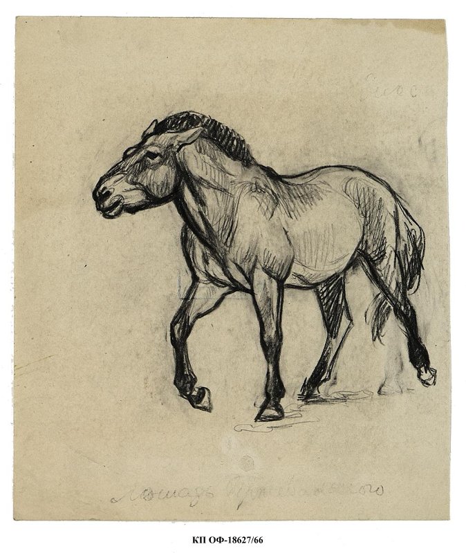 На листе вертикального формата изображена в профиль налево идущая лошадь Пржевальского. Голова ее поднята вверх, уши прижаты. Правая передняя нога согнута в колене и приподнята, левая задняя - отставлена назад. Хвост опущен вниз.