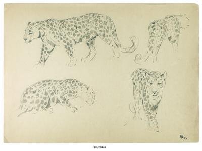 На листе горизонтального формата расположены четыре наброска леопарда. Вверху слева - идущий леопард в профиль влево; вверху справа - стоящий в три четверти направо. Внизу слева - зарисовка поедающего что-то леопарда, в правом нижнем углу - идущий леопард в фас.