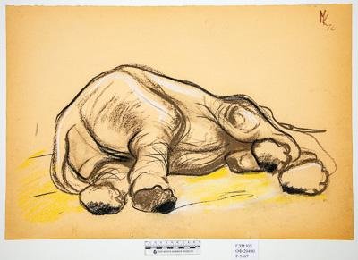 На листе горизонтального формата изображен лежащий на левом боку слон со стороны брюха и ног. Голова не видна.