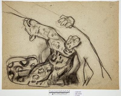 На листе горизонтального формата изображен сидящий снежный барс, обхвативший передними лапами ствол дерева и самозабвенно трущийся об него шеей и головой.