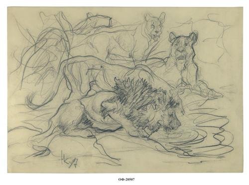 На листе горизонтального формата изображен прайд львов у водопоя. На первом плане пьет воду лев-самец, за ним виден силуэт пьющей самки. На третьем плане - силуэтные наброски еще 4 львиц.